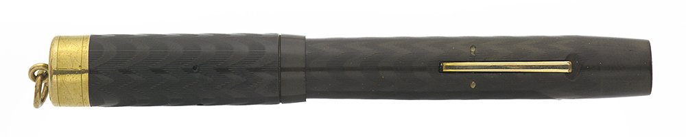 Color Black chased hard rubber (BCHR) with a gold filled cap overlay 1/4" wide. Ring top pen.