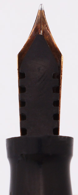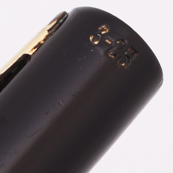 Condition Excellent condition with no cracks, chips, dents, or dings. This is a dark black, shiny pen with vintage styling and in a junior size. The cap and barrel have moderate scratching. The barrel has marks caused by the cap lip as well as by posting. The cap has a couple of deeper scratches near the top. The lever has light microscratching. The gold cap band has moderate microscratching, slight plating wear. The clip has plating wear on the ball end and across the top as well as moderate microscratching. The imprints and 3-25 numbering are both clear.