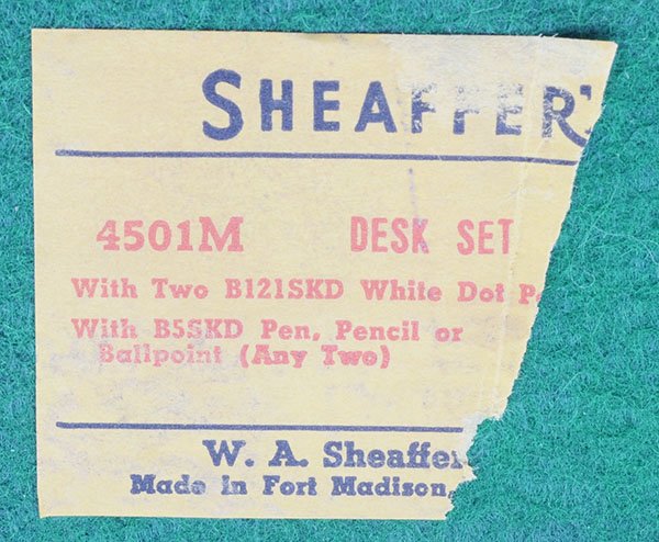 Product Name 4501M Desk Set. They had originally B121SKD White Dot pens. The bottom of the base still has enough of its label to make out the model names.