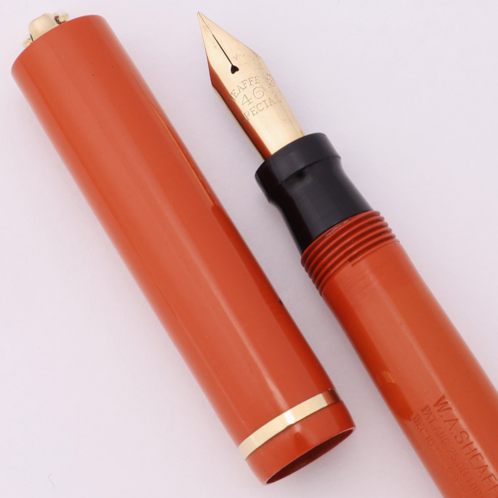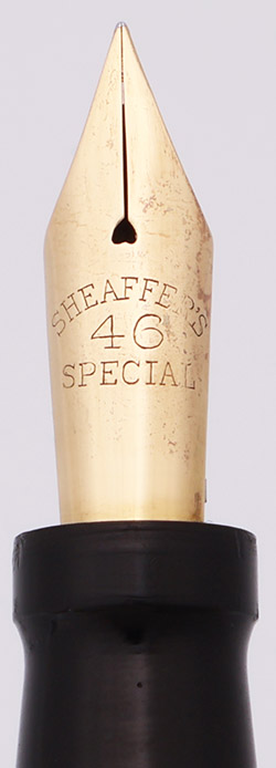 Nib FINE gold Sheaffer's #46 Special nib. It's smooth and firm, the tipping coverage is slightly uneven, but covers all of the writing tip and the nib has been aligned and smoothed. No flex (you sometimes see 46 Special nibs with a lot of flex, but that is not the case here).