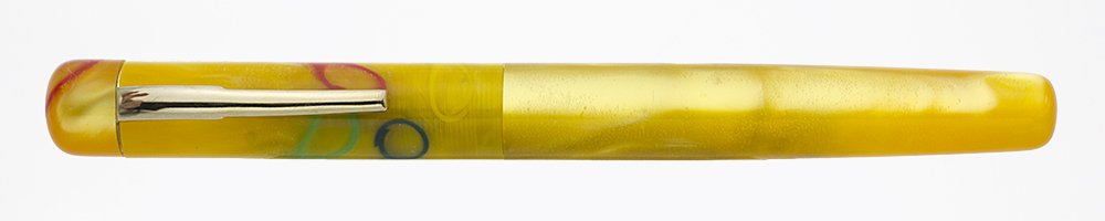 COLOR This pen is made of acrylic in yellow with multi-colored ovals. The clip is gold colored, and can be removed for a sleeker look.