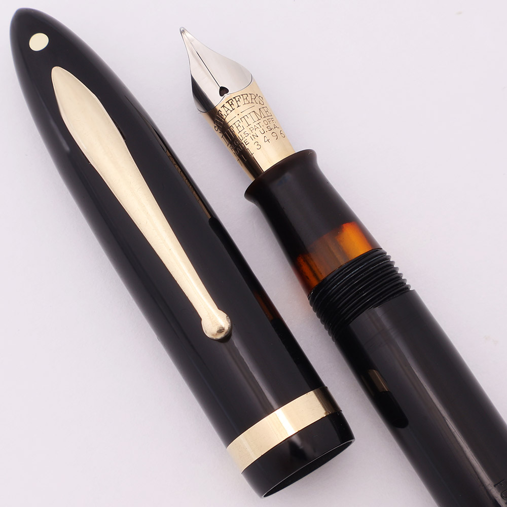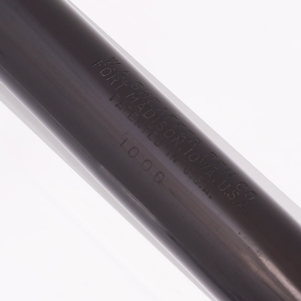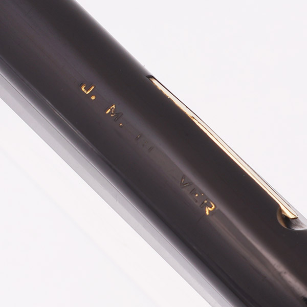 Condition Excellent condition for this velvety black, shiny pen with a well-lit amber ink viewing area. The barrel has marks caused by the cap lip and light scratching. It is personalized, "J.M. Ci...ver". The lever has plating wear along the edges and long, thin scratches. The cap has a fat mark to the left of the end of the clip. Otherwise, it has light scratching with more moderate scratching at the top peak. The cap band has some plating wear along the edges and moderate microscratching. The clip has light microscratching. The white dot looks great. The imprints are clear.