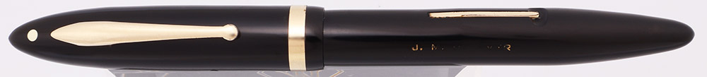 Color Velvety Black with gold filled trim. "Radius" clip is the flattened style, and it's got a medium sized 1/8" single cap band. Amber viewing window. The barrel is faintly personalized, "J.M. Ci ...ver. "