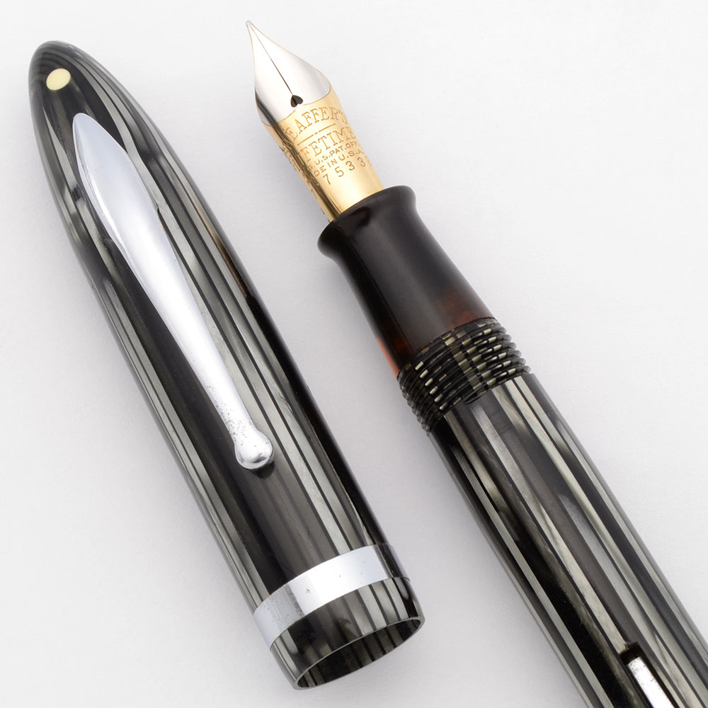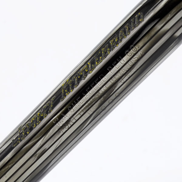 Condition Excellent condition with no cracks. This is a large-sized pen with lovely color striation from silver to black. It is shiny and handsome. The cap and barrel have light to moderate scratching. The barrel has marks caused by the cap lip, light overall scratching. The lever has moderate scratching and some small patches of pitting. The cap has moderate scratching with some heavier scratching, including a small chip at the very top. The cap band and clip are shiny with some light scratch marks. The white dot has yellowed and has a tiny scratch on one side. The barrel has a personalization, "Jimmy Kittlebrand". The imprints are nice and clear.