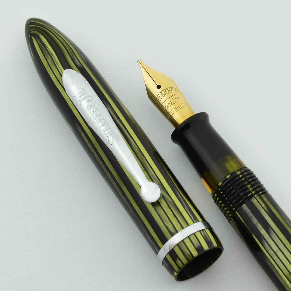 Nib SEMI-FLEXIBLE FINE. 14k "Junior" nib is one of the few Sheaffer flexible nibs from this era, and the flex can vary from nib to nib (some Juniors aren't flexible at all). It's not full flex, definitely semi-flex. Writing sample below.