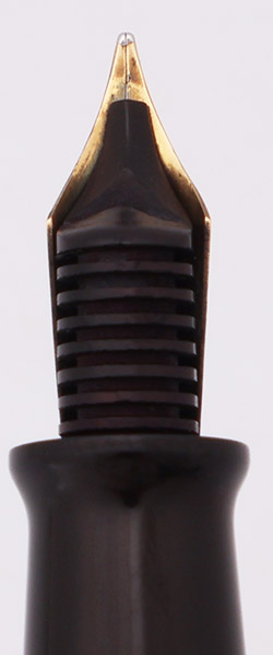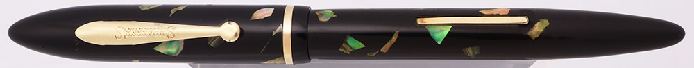 Condition. Excellent condition with no cracks, chips, dents, or dings. This is a shiny velvety black pen highlighted by colorful chips of mother-of-pearl. The cap and barrel have light to moderate wear. The barrel has marks caused by the cap lip. The lever looks nice with some plating wear around the open end. The cap band has quite a few small scratch marks but no plating wear. The clip looks excellent with some brassing around the ball end. There are bite marks around the top of the cap and at the end of the barrel. The imprints are very clear.