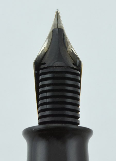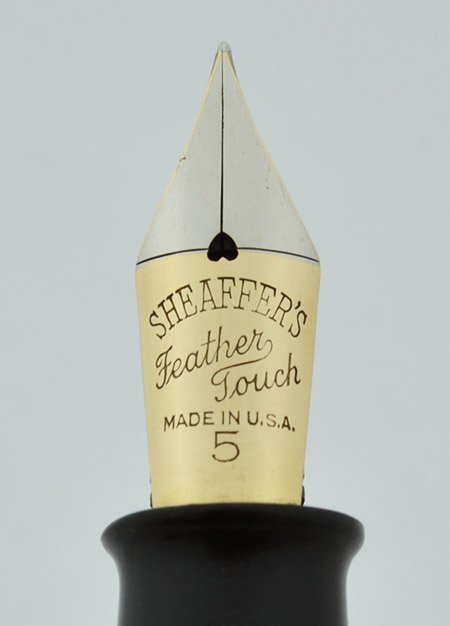 Nib FINE 14k Feather Touch #5 nib. It's two-tone, and both the tipping and the masking are in good condition, without much wear. There's just a little hint of flex to it.