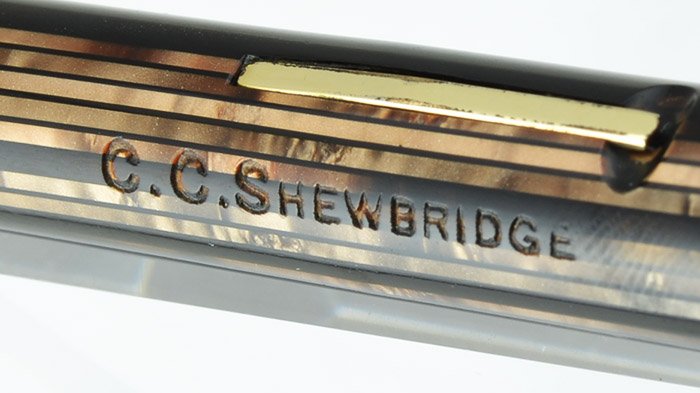 The barrel is engraved "C. C. Shewbridge" (see photos below). This is a very dark personalization and easy to miss, though we did try to throw a lot of light at it in the close-up below.