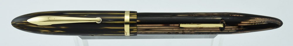Condition Excellent condition, no chips, dings, or dents. There are a couple of very tiny surface cracks on the top of the cap, which are purely cosmetic and hardly visible. There's a tiny indent on the very top of the cap, and some brassing on the trim, on the tip of the clip, the very edges of the lever, and some spots on the cap band. There are some very minor marks and scratches on the cap and barrel. The pen's imprint is fairly clear and readable, and its color is very good. The pen is fully restored and working well.