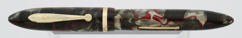 Color Red veins and gray pearl celluloid is marbled. It has thin gold plated trim.