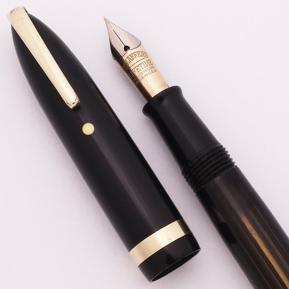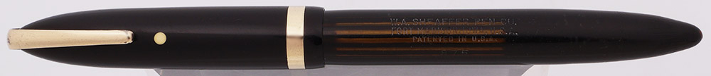Condition Very nice condition with no cracks. This is a dark, classically designed pen with excellent barrel transparency. The cap and barrel both have moderate to heavy scratching. The barrel has marks caused by the cap lip and a lot of small scratch marks on the blind cap. The cap band has moderate microscratching and two miniscule dots of pitting. The military clip has plating wear along the front edge and some tiny scratch marks on the backside as well as light microscratching. The white dot looks good. The imprints are clear.