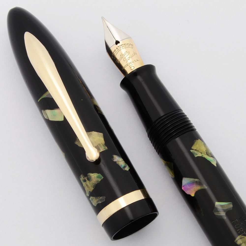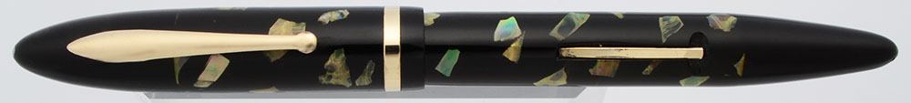 Color Black with chunks of mother-of-pearl embedded -- called by Sheaffer "Ebonized Pearl" -- with gold filled trim.