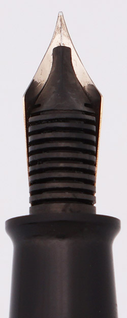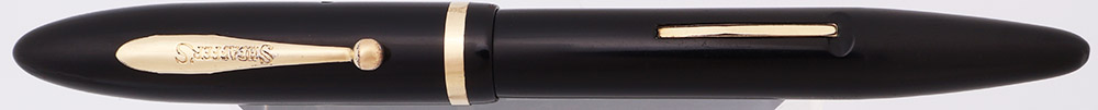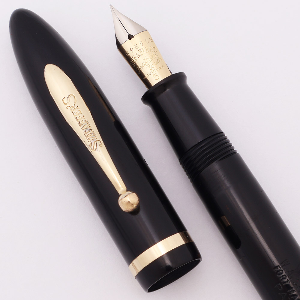 Condition Excellent condition. This is a beautifully shiny dark black pen. The cap and barrel have light to some moderate scratching. The barrel has marks caused by the cap lip, and an area of "pitting" where a finger might rest while gripping the pen. The lever bar has brassing along the sides. The cap also has some touches of pitting. The very top of the cap has what looks like some tiny cracks; there is a cap liner so we can't tell whether they are scratches or cracks. The cap band has scratching. The clip has some plating wear on the face (especially in the letters of the imprint) and around the ball end. The imprints are nice and clear.