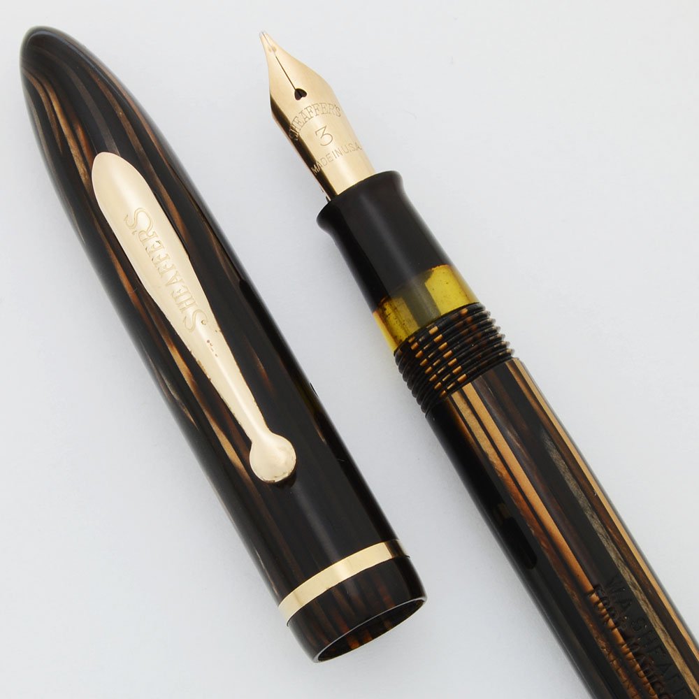 Condition Excellent + condition. No cracks or chips, dings, dents, or personalization. There is what appears to be a small tool mark near the tip of the nib (visible in the pictures below), but it doesn't affect the function at all. Some brassing on the clip and lever. The barrel is really clean, no dents or bite marks. The imprint is clear and easily read. The viewing section has excellent transparency. We've fully restored the pen and it's working very well.