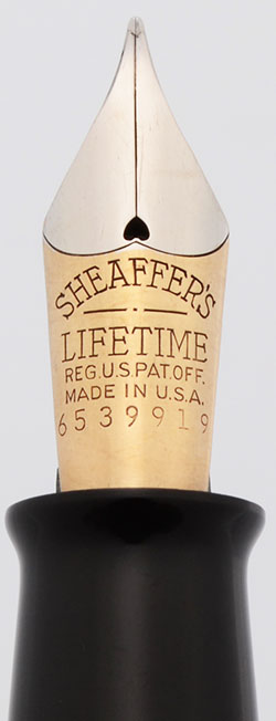 Nib MEDIUM 14k two-toned Sheaffer's Lifetime nib has a bit of a Waverly upturn, and is smooth with lovely tipping material. It's fairly firm. Serial number 6539919.