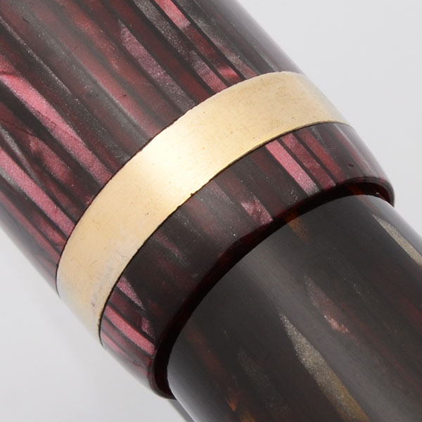 Color "Rose Glow" aka pink and grey striated celluloid. Gold plated trim with a single cap band and a flat ball humped clip.