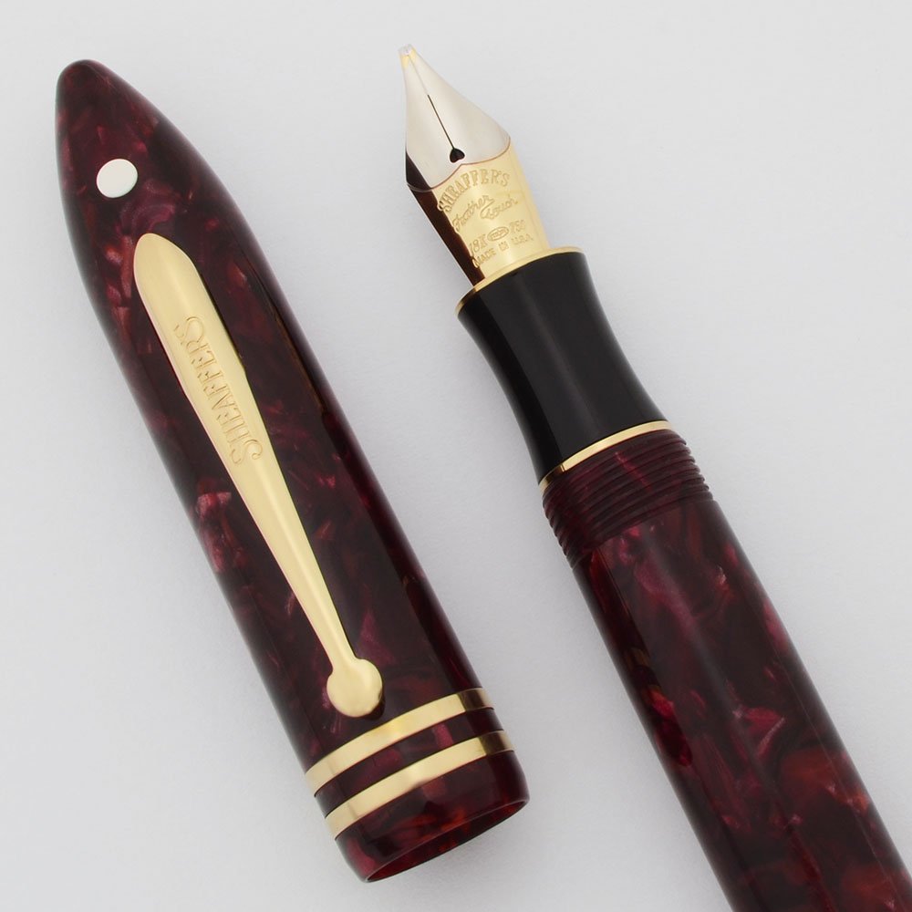 Color "Crimson Glow" is a beautiful marbled acrylic mix of reds with gold plated trim and two cap bands.
