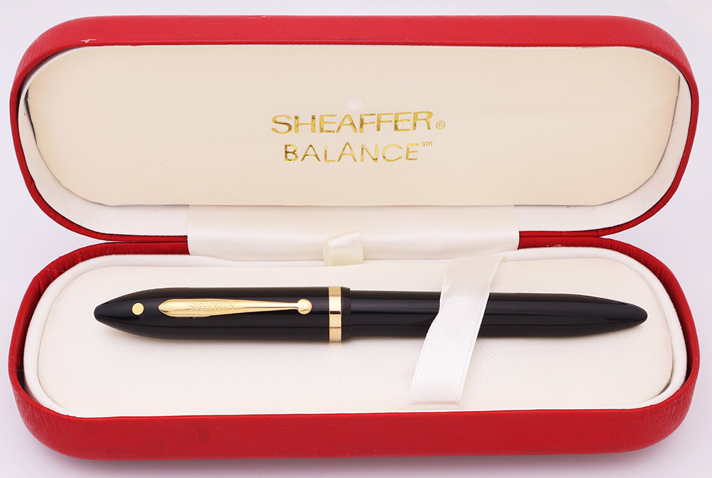 Condition Near mint condition with no cracks, chips, dents, dings. There is some microscratching and storage wear, and the white dot has aged to a light tan brown color. This is a shiny, classic, full-sized pen in a great color. The imprints are clear. Ships in original Sheaffer Balance box with paperwork.