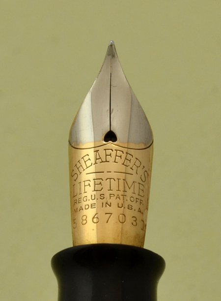 Nib | 14k "Sheaffer Lifetime" two-tone fine nib is in great condition with a good quantity of tipping material. Firm, no flex. Very smooth. |