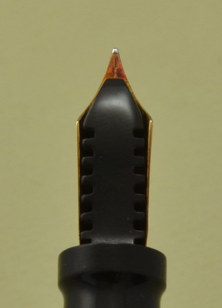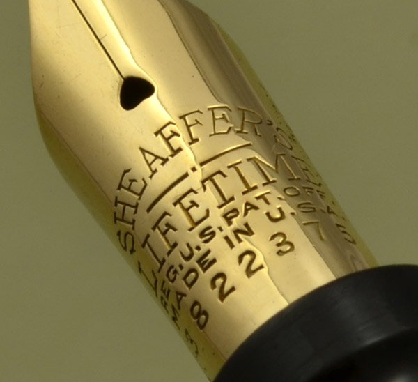 Imprinted with the name "I. MAGNIN & Co. " on the barrel. (This pen likely came from their San Francisco offices or store, because in the late 1920s they only had those operations and some boutiques in high-end Callifornia hotels.) Excellent condition. Extremely shiny, with only a little brassing on the trim. (Clip ball and high parts of the clip, and the cap band has a very thin strip of brassing along one edge.) We're seeing what may be a very short horizontal crack running thru the T in LIFETIME. The mark may in fact be a scratch, it's just too small to tell. We did not take the nib off the feed, so we were unable to examine it from the underside. |
