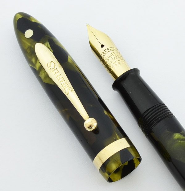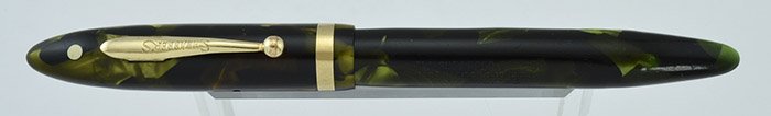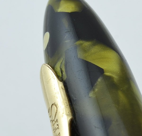 Condition User grade with a small crack stemming from where the clip attaches to the cap (see photos), but it still feels solidly connected. Otherwise scratches and hand wear. The trim has brassing on the clip ball. There are a couple of tiny cracks in the cap lip, none of which is even 1/16" in length. The cap screws on properly. There's also a strong imprint. Despite its wear, this pen is still in good working condition, and the color remains quite attractive.