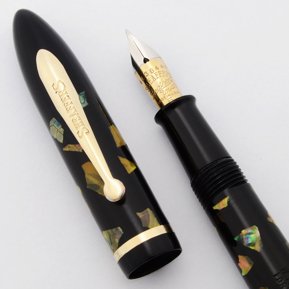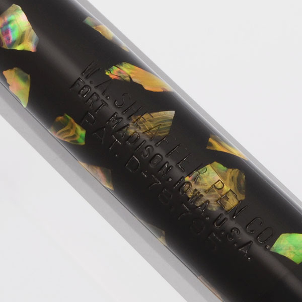 Condition Excellent condition with no cracks, chips, dents, or dings. This is a beautifully shiny dark black pen with colorful luminescent mother-of-pearl floating on the black surface. The barrel has marks caused by the cap lip. It has some small, random scratch marks and some tiny pin prick marks toward the end. There is also a slightly indented mark that goes around the circumference near the end of the barrel. The cap has light scratching. The lever looks great. The cap band has a thin line of plating wear along the edges. The clip has an area of plating wear on the end. The imprints are nice and clear.
