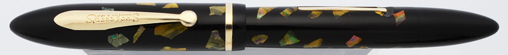 Color Black celluloid embedded with "floating" chunks of mother of pearl. Gold plated trim. White dot above the clip.