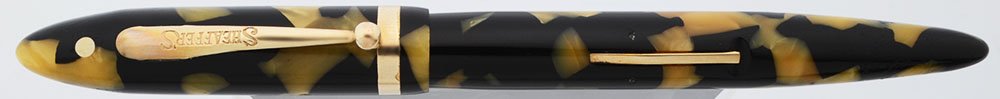 Condition Excellent condition. This is a long, tapered pen in a classic style and with a desireable color scheme. The pearls have ambered consistently. The cap and barrel have moderate wear. The section has quite a few scratches or tool marks. The barrel has bite marks and deep scratches at the end. The cap has similar marks at the top. The cap lip has some short hairline cracks so it should not be posted (we cannot give you a refund if you post the cap and cracks develop). The cap band has plating wear around the edges. The lever has some wear. The clip has a speck of plating wear along the very top edge. The white dot has some discoloration. The imprints are clear.