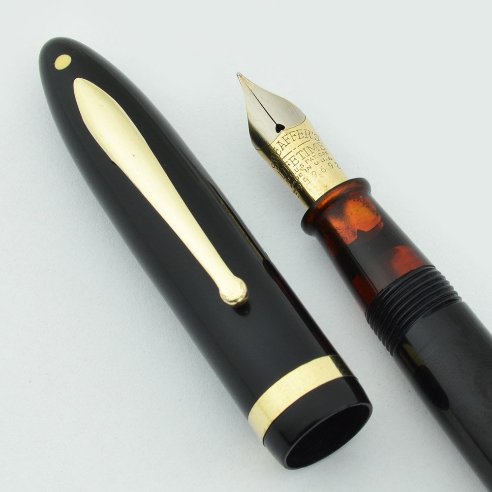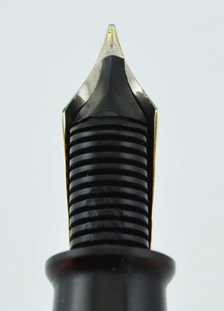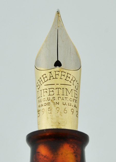 Nib FINE two tone gold Sheaffer's Lifetime open nib with a serial number. It's smooth with nice tipping material, and firm. It has a slight upturn to it at its tip.