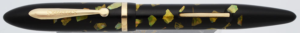 Color Ebony with floating Mother of Pearl pieces and with gold plated trim. The cap band is 1/8" wide.