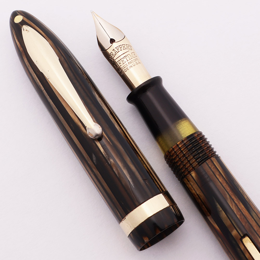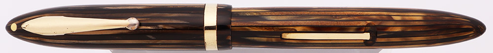 Condition Excellent condition with no cracks, chips, dents, or dings. This is a classically designed pen in a great color pattern. The barrel has light scratching with marks caused by the cap lip, and some more moderate scratching near the end of the barrel. The lever has some brassing on the sides, but the top face looks really good. The cap has light to moderate scratching and some small tooth marks. The cap band has brassing, mostly along the upper edge. The clip has brassing and plating wear on the tip and around the top edge, and some tiny dots of pitting. The imprints are clear.