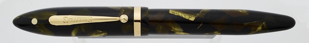 Condition Very nice condition with no chips, dents, or dings. Overall very shiny. This is a large, fat pen in a nice marbled color and in a classic design. The barrel has light scratching and marks caused by the cap lip. It has polishing marks toward the end. The lever has some pitting along the right edge. The cap has light to moderate scratching, especially at the top of the cap. The cap lip has three small cracks (see photos). The cap band and clip look great. The white dot is perfect. The imprints are clear.