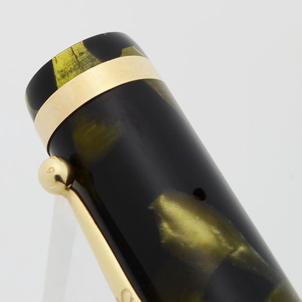 Color Black and green marble celluloid. Gold plated trim. 1/8" cap band. White dot.