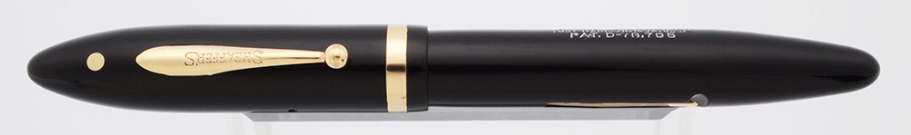 Condition Excellent + condition with no cracks, chips, dents, or dings. Super smooth and shiny. This is a large, tapered pen in shiny black with gold trim. The coloration is deep, dark, and shiny. Brassing and small dots of plating wear along top and bottom edges of the cap band. The rest of the cap looks quite good. The clip has plating wear on the ball; it is otherwise nice and shiny. The white dot is perfect. The imprints are crisp and clear.