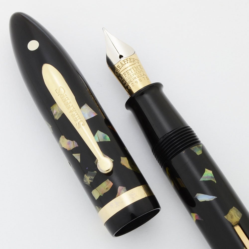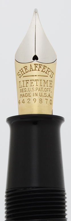Nib FINE 14k gold Lifetime nib, verging on the medium. It says Sheaffer Lifetime on it and is two- tone with serial number 4428870.