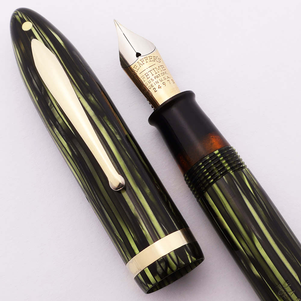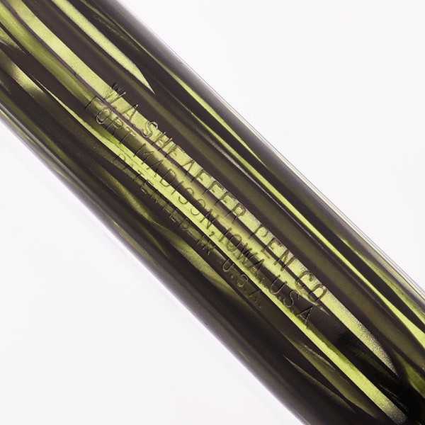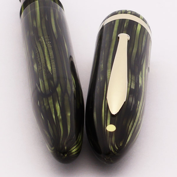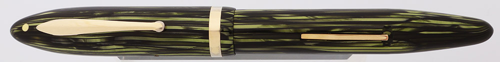 Color Marine Green striated celluloid with gold plated trim. It has a white dot above the clip and the radius clip. The cap band is 1/8" wide.