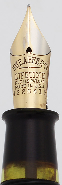 Nib FINE gold Lifetime nib. It's smooth and firm. The tipping material looks great. It originally was two-toned, but about half of the masking has been polished away. It has serial number 4283615.