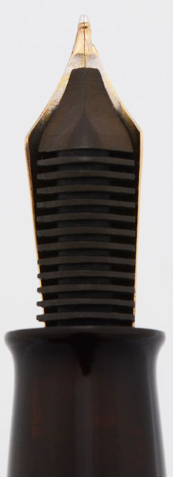 Nib FINE gold nib. It's smooth and firm. It says Sheaffer Lifetime, Made in Canada, on it. There is a groove on the left side of the nib (difficult to see in the photo) which we usually attributed to the usage of a straight-edge to draw lines. The nib is not damaged, and normal writing pressure will not be impacted by this groove.