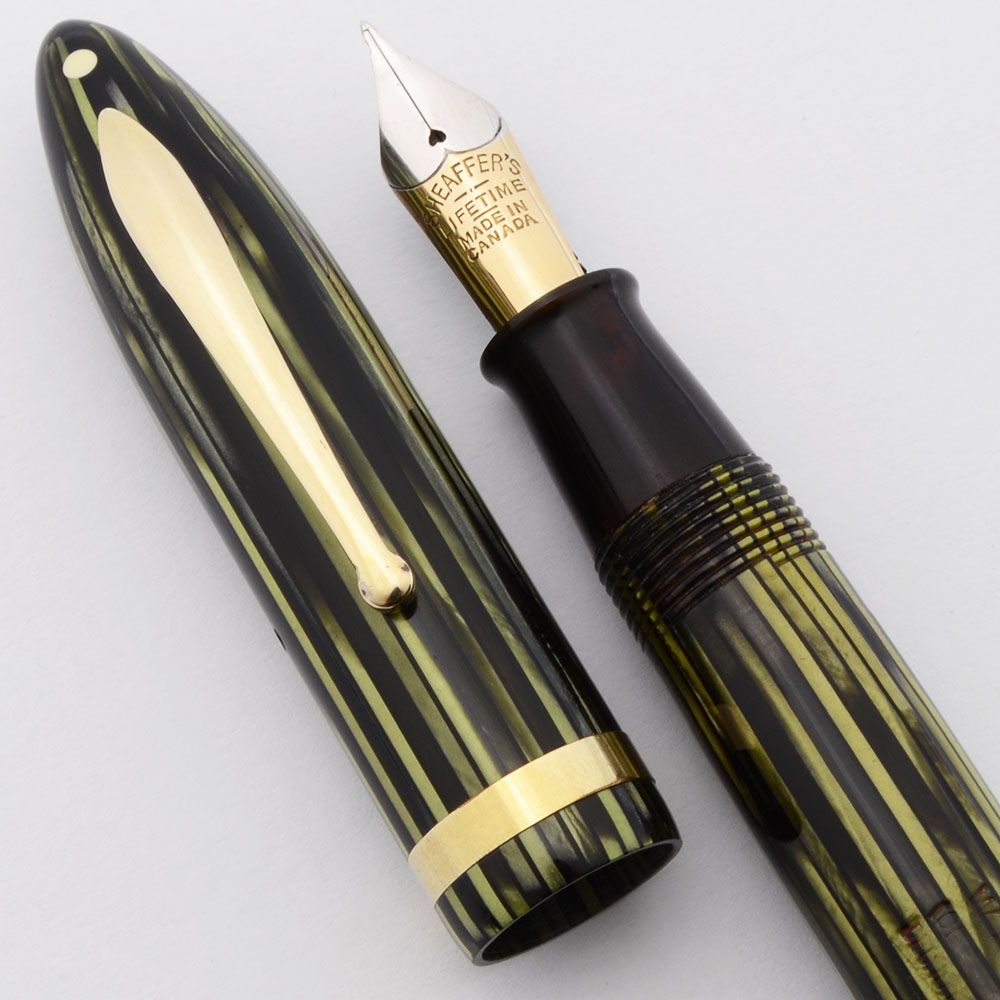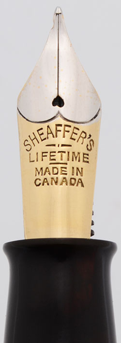 Manufacturer and Year Sheaffer, made in Canada -- 1936-42 (those were the years they made the Balance in this color and with this clip). The nib is marked Canada, but the middle line of the barrel imprint is obscured and it starts with "(OF ...." so we are guessing this might have been the Canadian imprint.