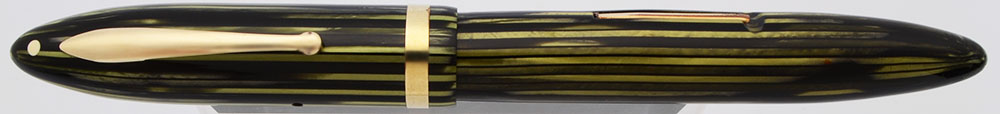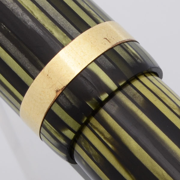 Color Green striated celluloid with gold plated trim. It has a white dot above the clip and the radius clip. The cap band is 1/8" wide.