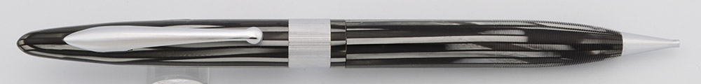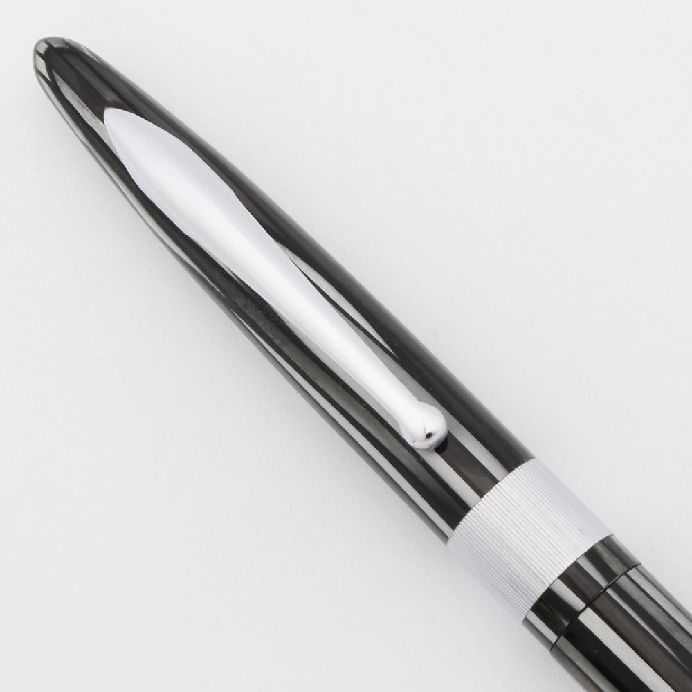 Color Grey pearl striated with chrome plated trim, a rigid radius style clip, and a 5/16" wide line-patterned gold plated cap band with a space for engraving.