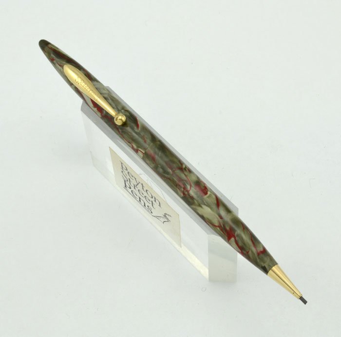 Excellent condition with some very small scratches here and there and some hand wear on the barrel, but because of the color it hardly shows at all. No cracks. The plating is in great condition, but it has a couple tiny spots of brassing on the ball of the clip, and the cone has a few tiny scratches and is a little worn at the very tip (see photos). The eraser has nearly all been used. this is a very nice pencil that still looks great after so many years. |
