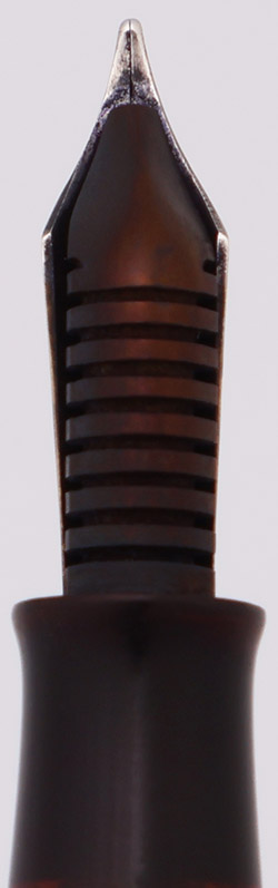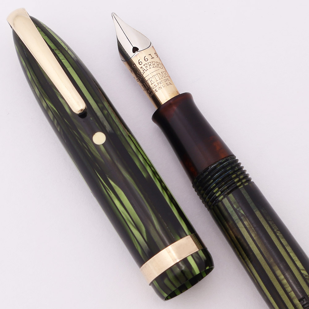 Condition Excellent condition for this smallish, beautifully colored, shiny pen with vintage design. The barrel has marks caused by the cap lip and moderate scratching. The lever has moderate microscratching. The viewing window under the section is very dark amber, nearly black. The cap has a small crack under the band at the cap lip. It has moderate to heavy scratching with surface roughness to the right of the clip. The cap band has light plating wear and moderate microscratching. The clip has just light microscratching. The white dot has a small scratch along the top edge and is slightly yellowed. The imprints are clear.