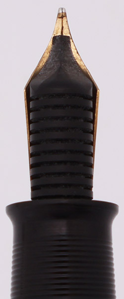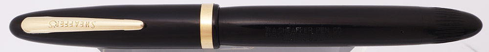 Condition Excellent condition with no cracks, chips, dents, or dings. This is a velvety black, shiny pen in a classic design. The cap and barrel have light to moderate scratching. The barrel has marks caused by the cap lip and a few long scratches near the imprint. The viewing window has yellowed but it has good clarity. The cap has a few long scratches and a few smudgy marks above the cap band. The cap band has light microscratching. The clip has light microscratching. The imprints are very clear.