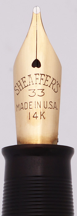 Nib Medium (verging on the broad) 14k nib is marked #33. Excellent uniform tipping material.
