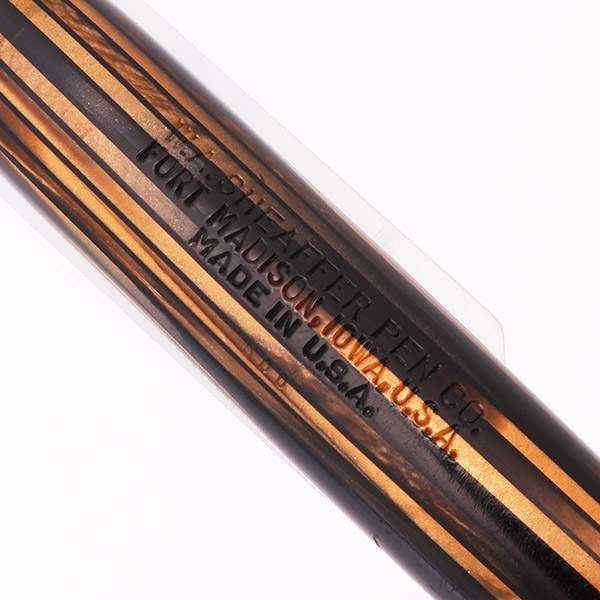 Condition Excellent condition with no cracks, chips, dents, or dings. This is a relatively short, handsomely colored, shiny and classically designed pen. The cap and barrel have light to moderate scratching. The barrel has marks caused by the cap lip. There is some moderate scratching and shallow tooth marks at the end of the barrel. The lever bar has brassing along the sides. The cap band has microscratching and some light plating wear. The clip has microscratching. The imprints are crisp and clear.