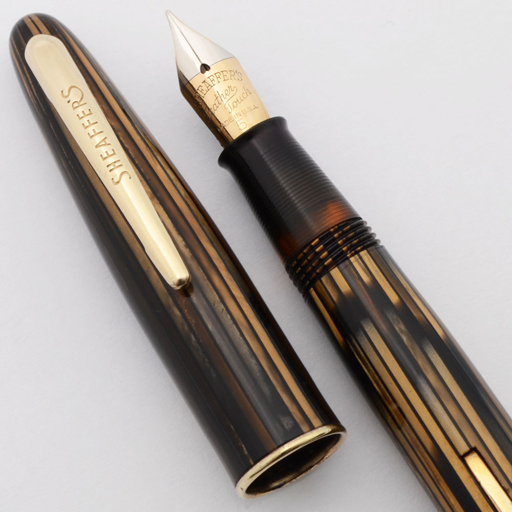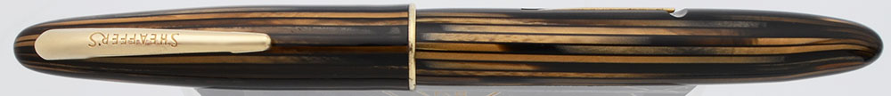 Color Brown striated body and cap with gold plated trim. Thin wire cap band. Amber viewing window.