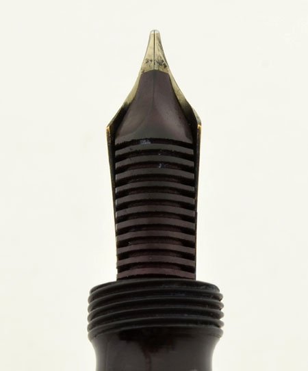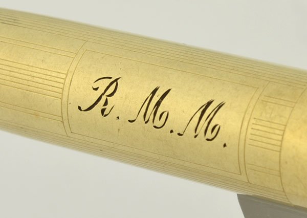 Excellent plus used condition. The only flaws are some worn masking on the nib, and light wear on the cap. Very good imprint on the body with only very light scratches. The cap is excellent with no brassing, and no dents aside from a pin-sized one near the clip. The filling system works very vigorously, we replaced the sac, and we'll guarantee it for a year. Personalized "R.M.M." on cap. |