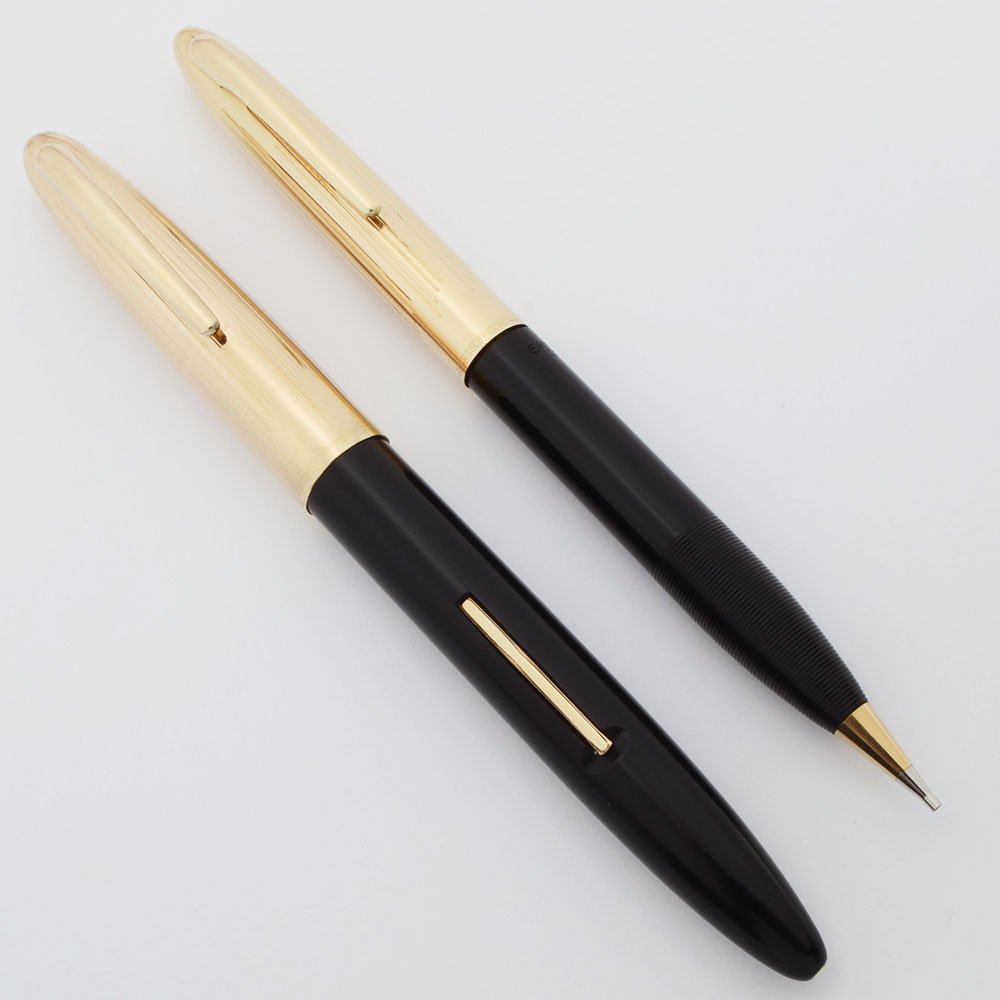 Color Black barrels and fountain pen section. 1/10 14k Gold filled caps, clips, and pencil cone..
