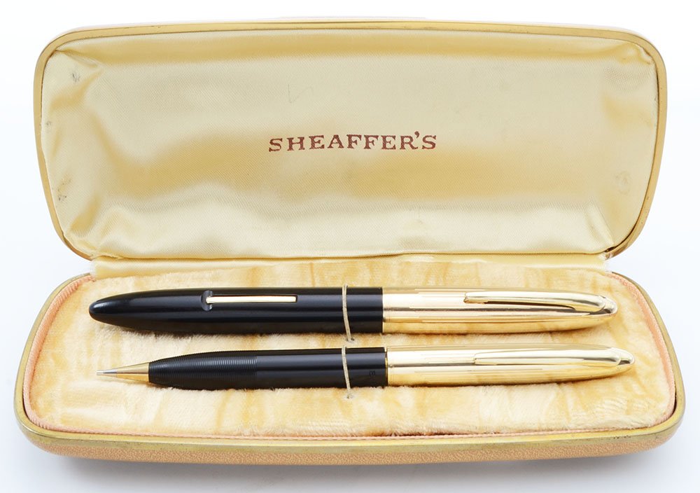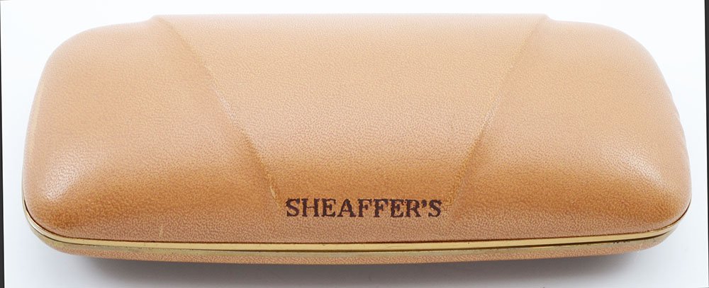 Condition Excellent condition for this lovely pen and pencil set that comes in its original Sheaffer's hard-sided box. The fountain pen barrel has moderate scratches and wear. The section has one spot of wear toward the top. The fountain pen cap has light to moderate scratching though it looks nice and shiny. The mechanical pencil barrel has light scratching with three short deeper scratches above the lined section on the shiny part of the barrel The cap and cone at the end of the pencil look great as does the clip. No cracks, chips, dings, or dents. All imprints are clear. The box is a hard-sided caramel color with gold trim and with light gold silk and velvet interior.